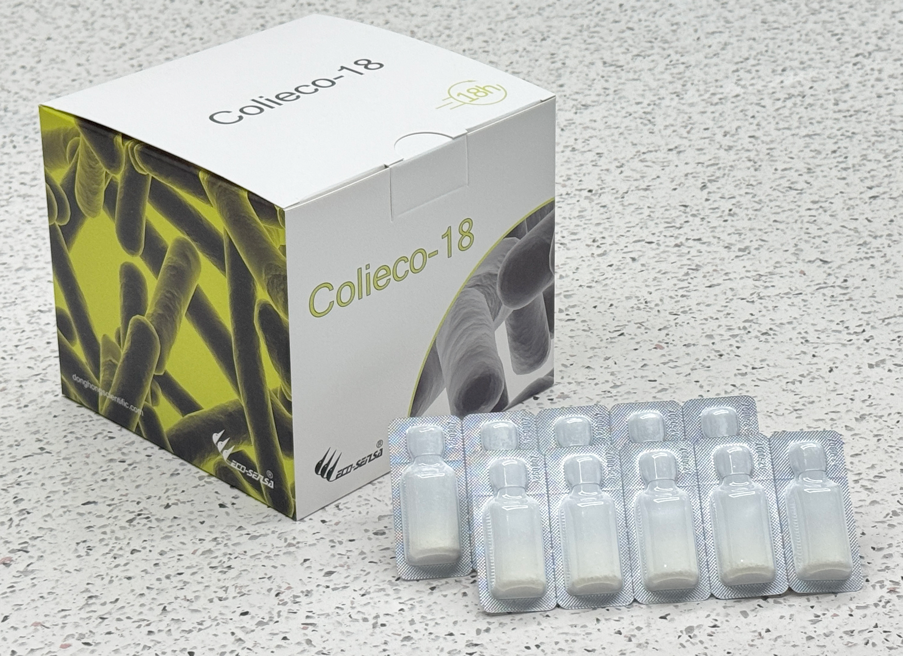 Coelieco-18 é um teste rápido para detectar simultaneamente coliformes totais e Escherichia coli em amostras de água, fornecendo os resultados do teste em 18 horas. É adequado para toda a matriz aquosa.